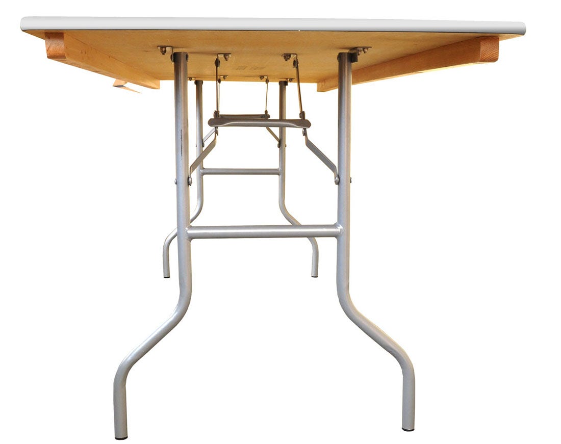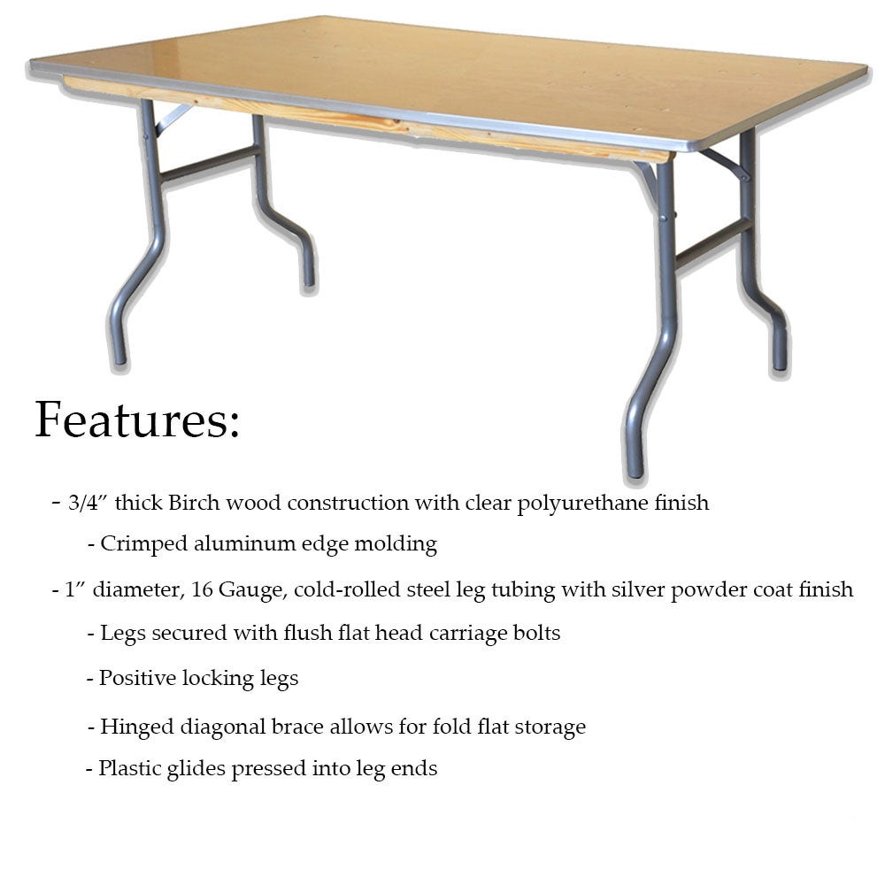 Our 6 foot commercial wood folding tables are designed with unsurpassed excellence and meant to stand up to the abuse of constant set up and tear down. Not only is this banquet folding table durable enough for the everyday rigors of commercial usage, but this table can be utilized in the home for setting up your party and event plans. It’s ideal for usage in banquet halls, training rooms, seminar settings, for use with hotel buffets and it makes an exceptional table for the office. Outfit your business with our commercial-quality folding tables today!